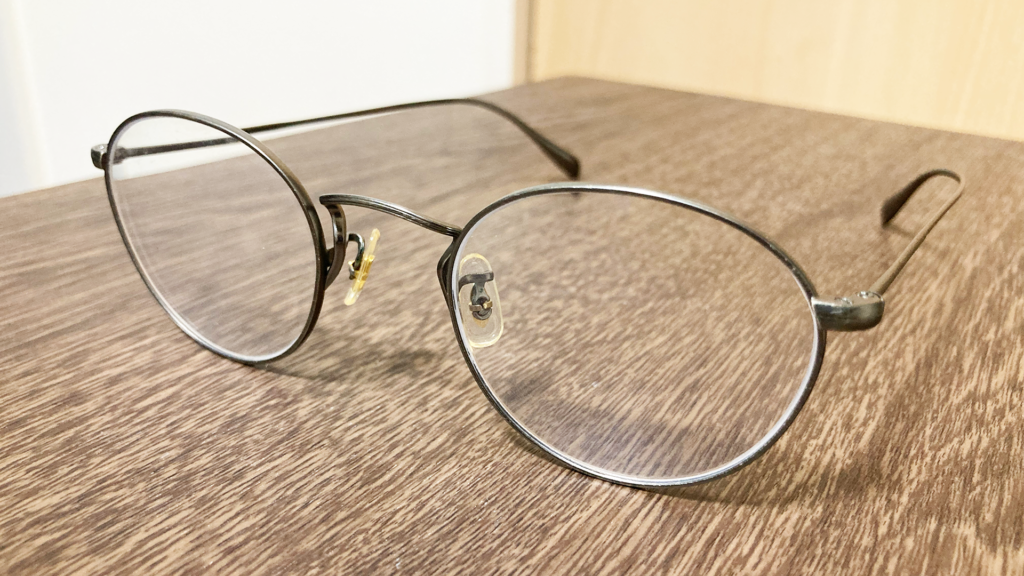 iPhone SEで撮影したメガネ(ノーズパッドは黄ばんでいるわけでは無く、金具の金色が拡散しているだけですー)。